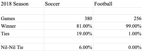Surprisingly, there are not as many ties (draws) in soccer as it seems. Less than 20% of games in the EPL end in a tie (draw), and only 6% of games end in the dreaded nil-nil tie (draw).