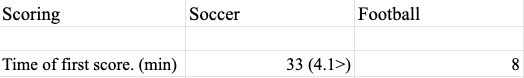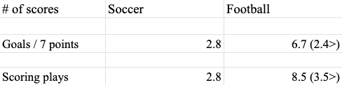 Anyways, you can see that the average football (NFL) game has 2.4 times more scoring than a soccer match (EPL) (for football, 7pts points equal 1 "score"). It is even worse (3.5x) when you look at the total number of scoring plays (this includes field goals, safeties, and the really rare 'return of extra points').