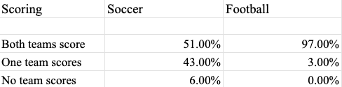 Looking at it a different way, only in half of the games do both teams score in the EPL, compared to 93% of NFL games.