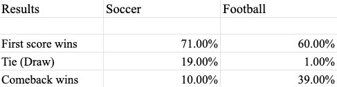 It gets worse. While the difference in the number of games where the first team to score wins between the two is small (only 10 % pts), the number of comeback wins in the EPL is pathetically small. When watching NFL games, out of every 10 games you watch, four will have a team comeback from a deficit and win the game. In soccer, it's 1 out of 10.