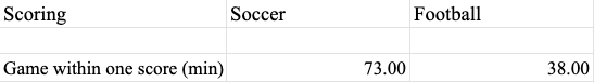 I believe what holds the soccer fans attention is the potential to score (regardless if they ever do). In over 80% of a game, both teams are ‘in it'. Only 11% of games are blowouts (>3 goals). In the NFL, in 27% of games, the winning team finishes with greater than two scores (>14 pts).