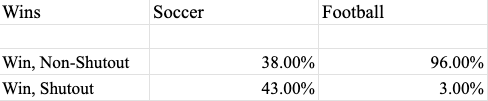 But things get worse when you look at the 'wins'. Over half of the wins in the EPL are shutouts. Over all of the games, less than 40% of games have a winner where both teams score.